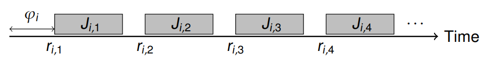 - Phase ϕi : Task Ti의 첫 번째 잡인 Ji,1의 release time ri,1. 즉 가장 처음 실행되어야 하는 잡이 등장하는 시간이다.