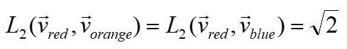 를 다시 계산하게 되면, red-orange의 거리는 루트0.2, red-blue의 거리는 루트2가 된다.
