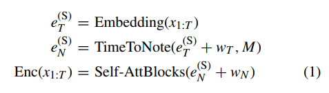 그런 다음, 우리는 이를 피아노 롤과 일련의 음표 사이의 정렬 행렬 M ∈ {0, 1} T×N으로 average pooling을 통해 음표별 임베딩 e(S)N으로 변환한다.