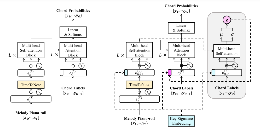 각 모델에서 Transformer 인코더는 주어진 멜로디를 받고, 디코더는 멜로디와 코드 간에 계산된 어텐션 가중치에 따라 코드 순서를 생성한다. 제안된 모델의 전반적인 구조는 그림 1에 설명되어 있다.